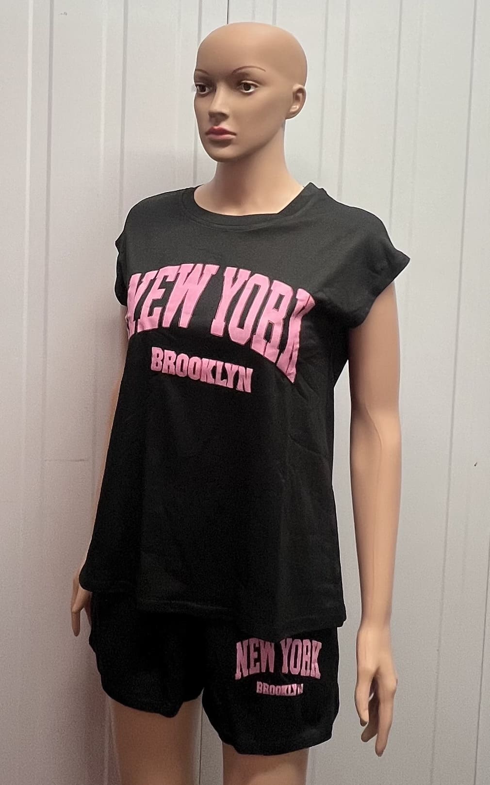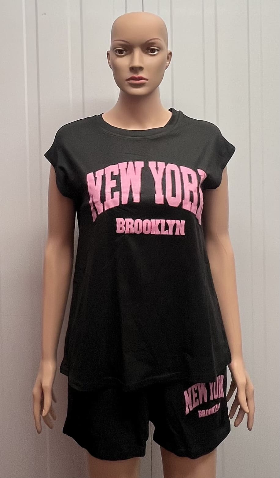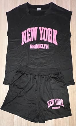 Shorts: The matching black shorts are designed to sit comfortably just above the knee, providing a flattering fit and ease of movement. The same striking NEW YORK and BROOKLYN pink lettering on the shorts ties the whole set together for a coordinated, sporty look.